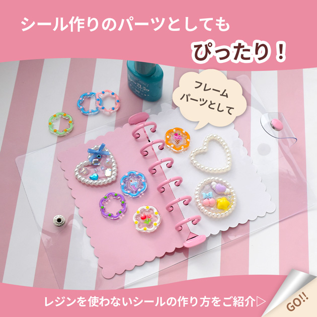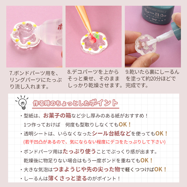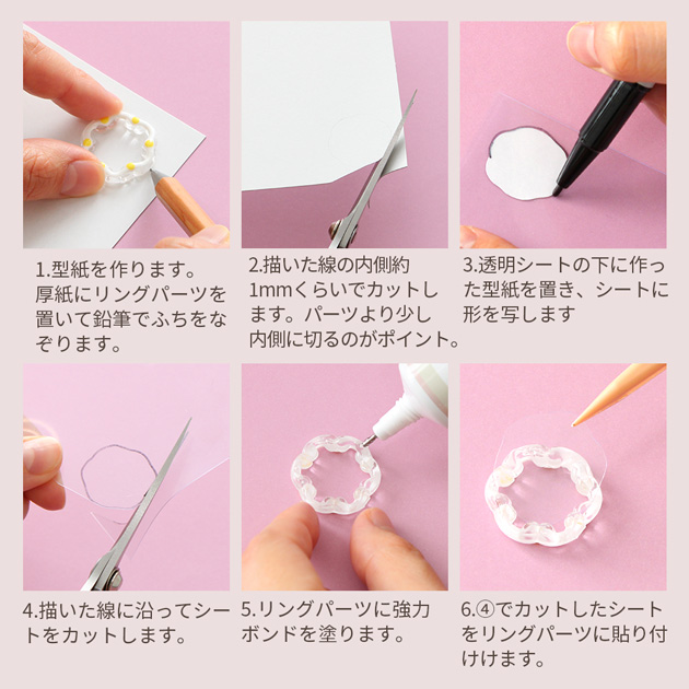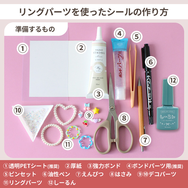 | 準備するおすすめ商品はこちら ・透明PETシート ・強力ボンド「マイピタ」 ・ピンセット ・油性ペンマッキー ・万能はさみ ・ボンドパーツ用 ・リングパーツ ・しーるん ご自宅にあるもので代用して頂いても お作り頂けます。 |