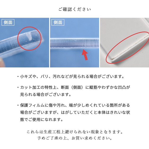 | ■ご注意 | ・小キズやバリ、多少の汚れ等ある場合がございます。 ・カット加工の特性上、側面に縦筋やわずかな凸凹が見られる箇所がある場合がございます。 ・保護フィルムに傷や汚れが見られる箇所がある場合がございますが、はがすと本体はきれいな状態でご使用いただけます。