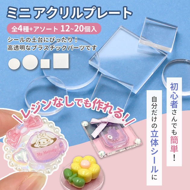 ミニ アクリル プレート 全4種 12〜20個入 可愛い 小さい ■ 透明 シール パーツ 丸 四角 プラスチック 台座 デコ レジン 手作り ■