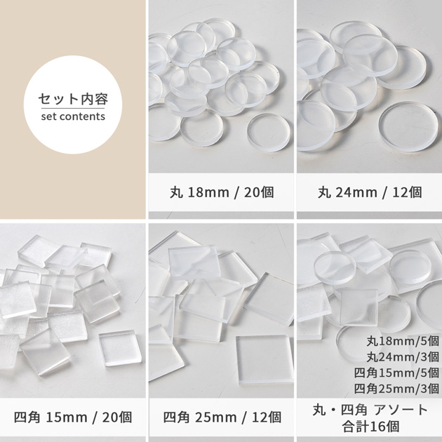 | ■商品番号・内容量 | 【4808-1】丸18mm/20個 【4808-2】丸24mm/12個 【4808-3】四角15mm/20個 【4808-4】四角25mm/12個 【4808-5】丸・四角4種アソート/16個 (内訳:丸18mm/5個、丸24mm/3個、四角15mm/5個、四角25mm/3個 )