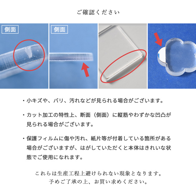 | ■ご注意 | ・小キズやバリ、多少の汚れ等ある場合がございます。 ・カット加工の特性上、側面に縦筋やわずかな凸凹が見られる箇所がある場合がございます。 ・保護フィルムに傷や汚れ、紙片などが見られる箇所がある場合がございますが、はがすと本体はきれいな状態でご使用いただけます。 ・生産ロットにより色合いが若干異なる場合がございます。 ・画像では100%同じお色を表現することが出来ません。出来る限り近いお色になるよう心がけてはおりますが、お色のイメージが違うことによる返品は承ることができません。 上記の理由での返品交換は承ることは出来ません。。 |