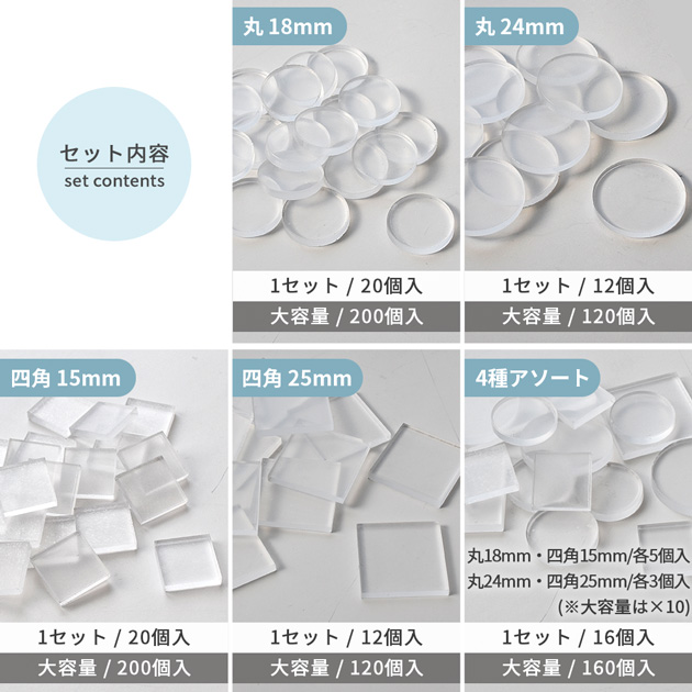 | ■商品番号・内容量 | 【224808-1】丸18mm/200個入 【224808-2】丸24mm/120個入 【224808-3】四角15mm/200個入 【224808-4】四角25mm/120個入 【224808-5】4種アソート/160個入 (丸18mm/50個、丸24mm/30個、四角15mm/50個、四角25mm/30個 ) |
