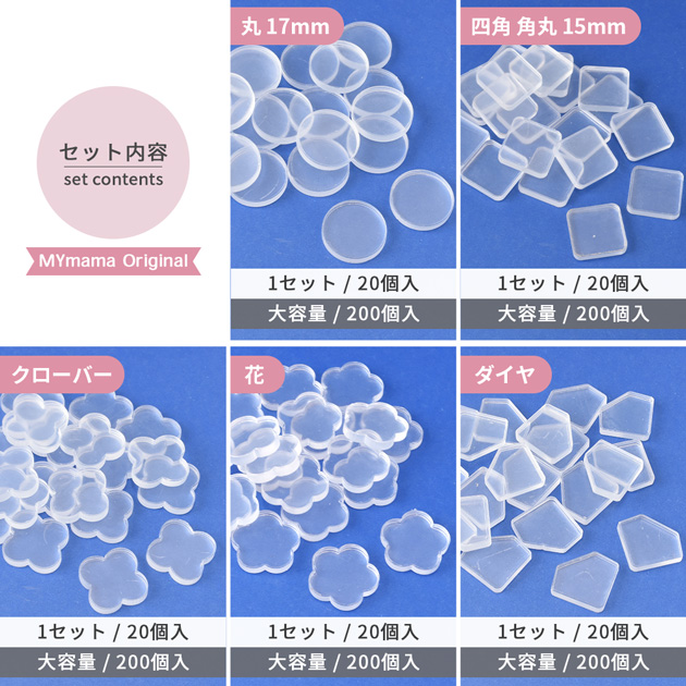 | ■商品番号・内容量 | 【224808-6】丸17mm/200個入 【224808-7】四角 角丸15mm/200個入 【224808-8】クローバー/200個入 【224808-9】花/200個入 【224808-10】ダイヤ/200個入 【224808-11】ハート/200個入 【224808-12】星/200個入 【224808-13】キャンディ/200個入 【224808-14】くま/200個入 【224808-15】ねこ/200個入 【224808-16】10種アソート/200個入 (MYmamaオリジナルデザイン/各20個ずつ) |