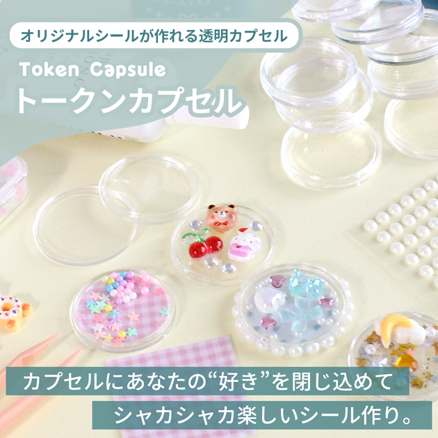 透明なプラスチック製のトークンカプセル。好きなイラストや封入パーツを入れるだけで