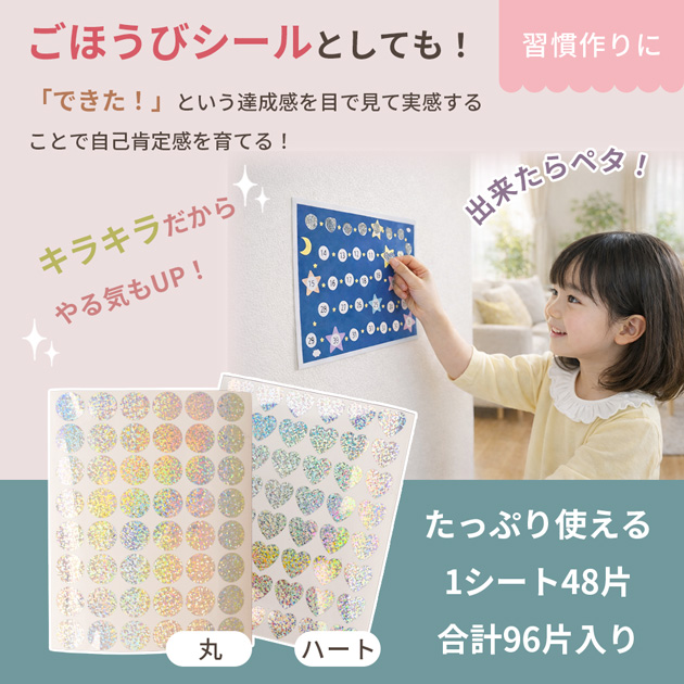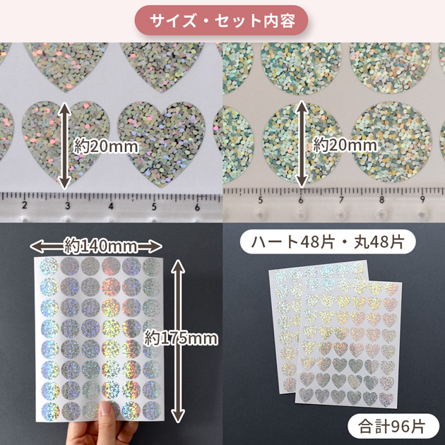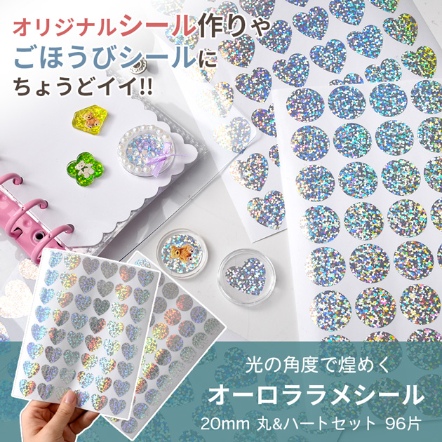 20mm 大きめ キラキラ オーロラ ラメ シール 丸 ハート 96片 ■ ホログラム ごほうびシール おはじきシール 台紙 シャカシャカ 封入 かわいい ■