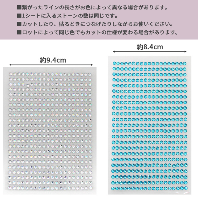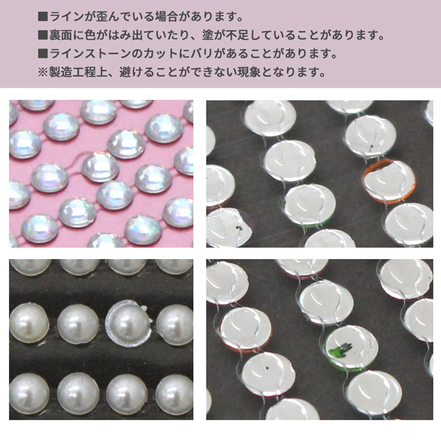 | ■ご注意 | ・ストーンの列数はは生産ロットやカラーによって異なります。 ・ラインストーンに、小キズ、擦れ、欠け、位置のズレ 汚れ等がある場合がございます。 また、ストーンやビーズの密度や形にバラツキ、色の違うストーンが混ざっている場合がございます。 ストーンはテープ部分に接着されております。強くこすったり、強い衝撃を与えると外れる場合がございます。お取り扱いにはご注意ください。 ・画像では100%同じお色を表現することが出来ません。実際のお色味より若干異なる場合がございます。 上記の理由での返品・交換を承ることは出来ません。。 |