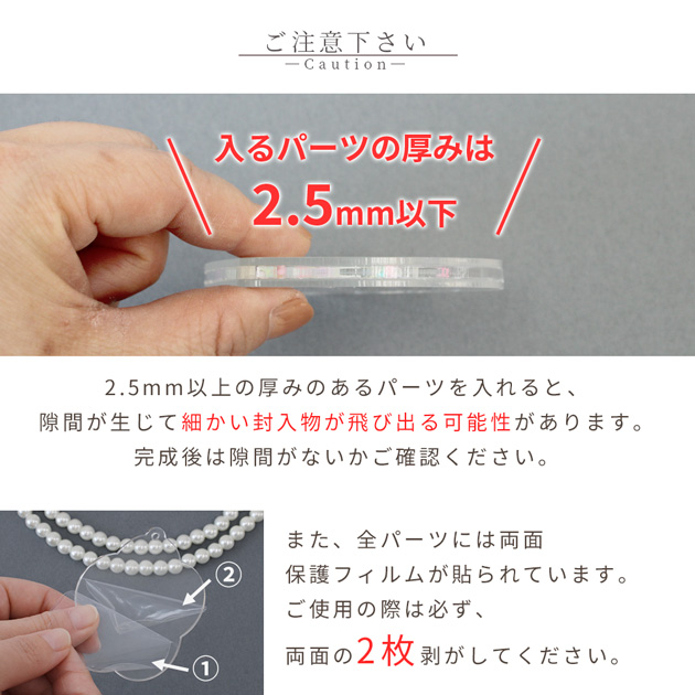 クリアなアクリル素材だから、パーツやラメ、ビーズなどを入れて
