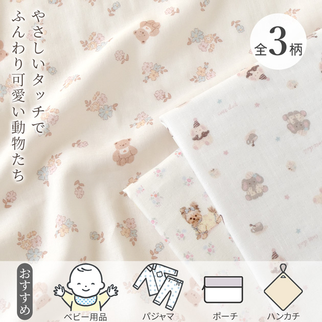 | 幅広 約150cm幅 ダブルガーゼ 生地 ラブリーフレンズ 全3柄 | 幅広 約146cm幅 ダブルガーゼ 生地 アニマルズ 全4柄 |