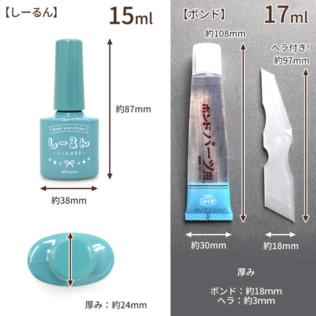 | ■サイズ | 【しーるん】15ml 約87×38×24mm 【パーツ用ボンド】17ml 約108×30×18mm ※その他、詳しくは画像をご参照ください |