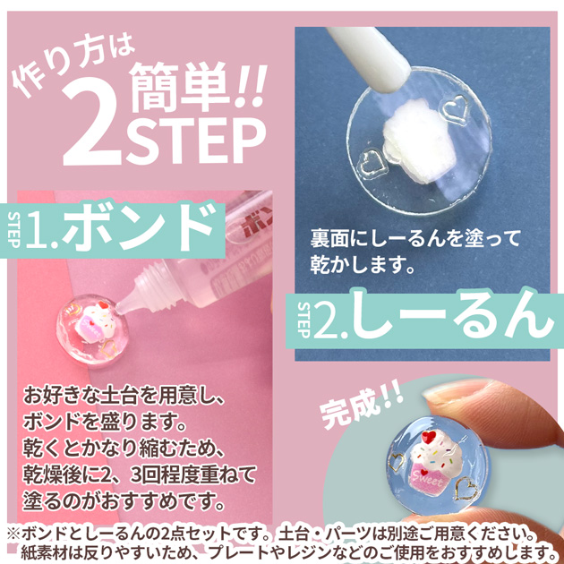 | ■素材 | 【しーるん】アクリレーツコポリマー/ジメチコン/フェノキシエタノール/水 【パーツ用ボンド】シリル化ウレタン樹脂(36%)、水(64%) |