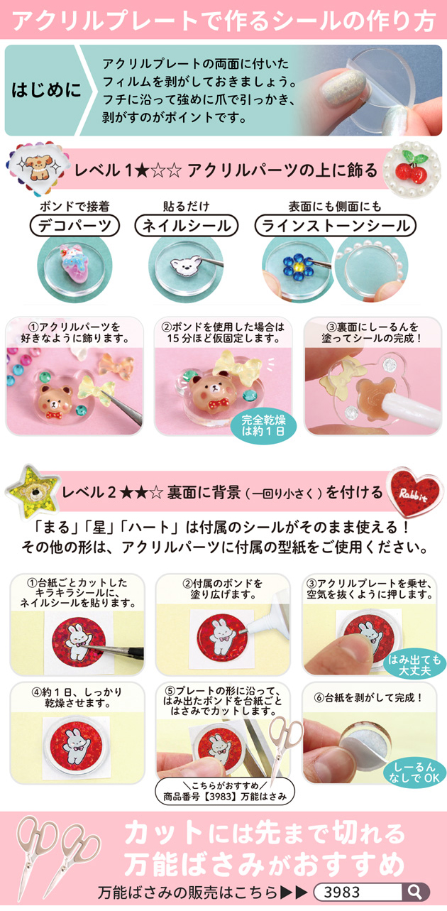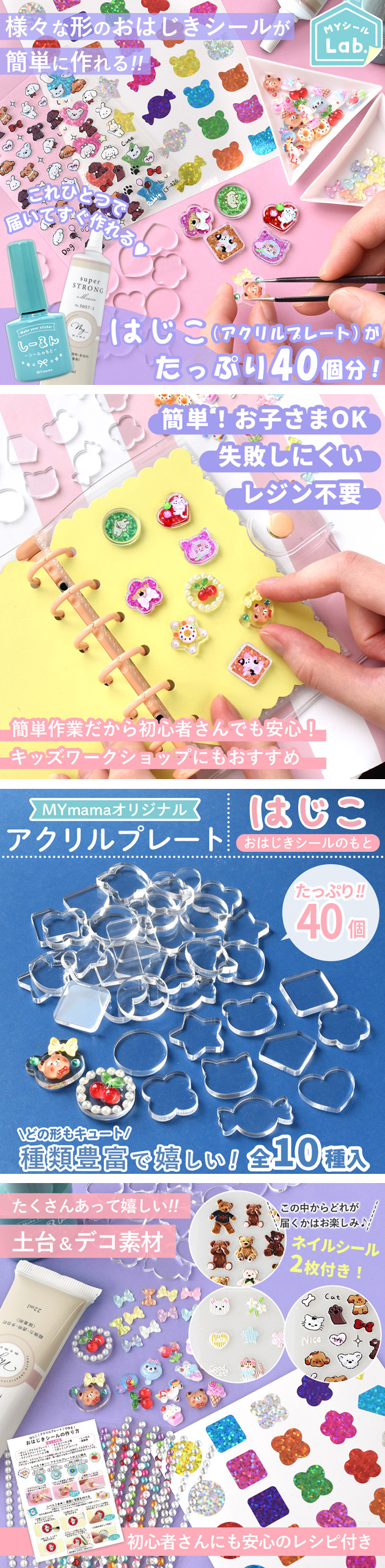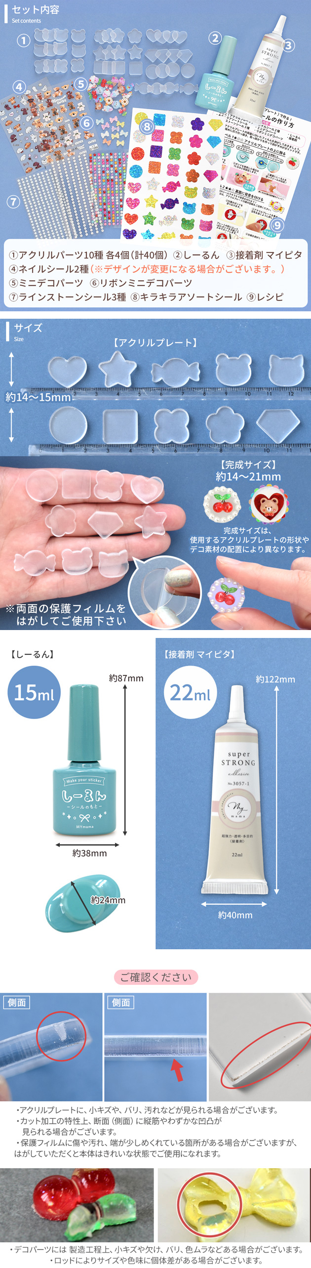 | ■セット内容 | ・ミニアクリルプレート 10種 各4個(計40個) ・しーるん ・接着剤 マイピタ ・ネイルシール2種(下記の中からランダムにお届け。デザインが変更になる場合がございます。) ネイルシール/くま ネイルシール/いぬ&うさぎ ネイルシール/グッドキャット ・デコパーツ ガーリーポップ ・デコパーツ リボン ・ラインストーンシール 3種 ・キラキラアソートシール ・レシピ |