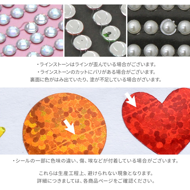 | ■ご注意 | 【ミニアクリルプレート】 カット加工の特性上、側面に縦筋やわずかな凸凹が見られる箇所がある場合がございます。 ・保護フィルムに傷や汚れが見られる箇所がある場合がございますが、はがすと本体はきれいな状態でご使用いただけます。 【ラインストーン】 ・ラインストーンはラインが歪んでいる場合がございます。 ・ラインストーンのカットにバリがある場合がございます。 ・裏面に色がはみ出ていたり、塗が不足している場合がざいます。 【シール】 ・シールの一部に色味の違い、傷、埃などが付着している場合がございます。 【全品共通】 ・製造工程上、細かな擦れ、小さな傷、バリ、欠けがある場合がございます。 ・生産ロットにより、サイズ・色合いが若干異なる場合がございます。前回お買い上げの商品と異なる場合がございます。 ・画像では100%同じお色を表現することが出来ません。出来る限り近いお色になるよう心がけてはおりますが、お色のイメージが違うことによる返品は承ることができません。 上記の理由での返品交換は承ることは出来ません。 |