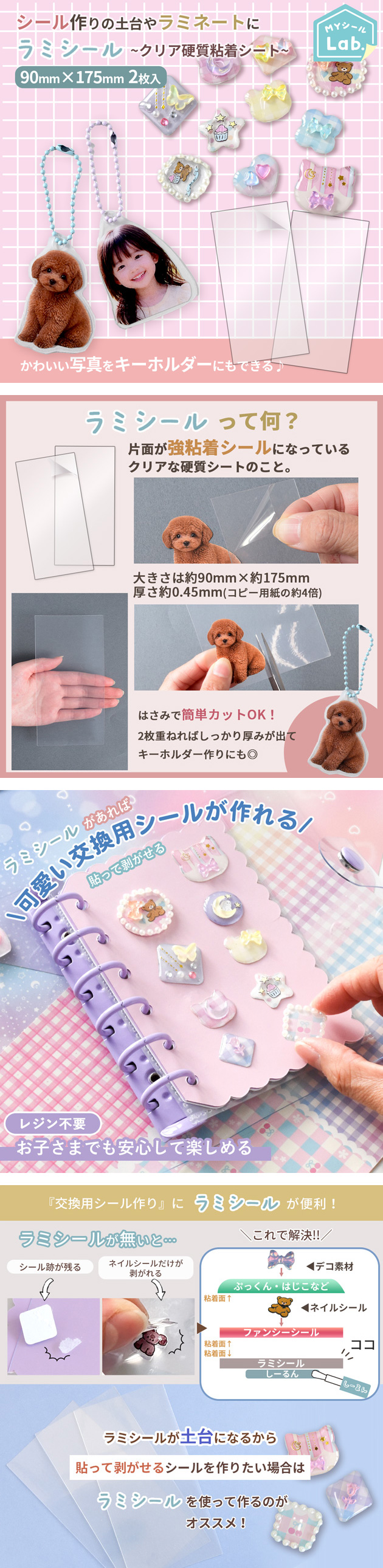 強粘着 硬質 クリアシール 2枚入 90mm×175mm ラミシール ■ シール交換 シール帳 立体 ステッカー 防水 ウォータープルーフ かわいい クリア ■