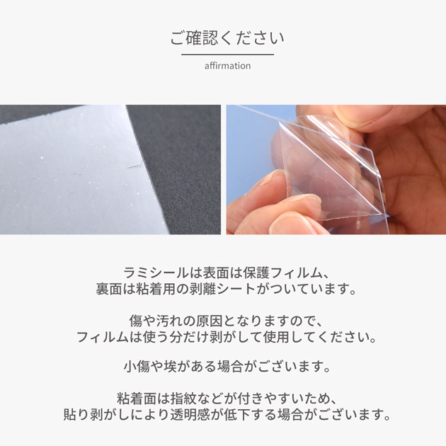| ■ご注意 | ・傷や汚れの原因となりますので、保護フィルムは使う分だけ剥がしてお使いください。 ・粘着面は指紋などが付きやすい素材のため、貼り剥がしにより透明感が低下する場合がございます。 ・製造工程上、細かな擦れ、小さな傷、ある場合がございます。 表面の保護フィルムを剥がして頂ければきれいになる場合がございますので 一度ご確認下さい。 ・表は保護フィルム、裏は粘着用の剥離シートとなっています。 ・生産ロットにより、サイズ・色合いが若干異なる場合がございます。前回お買い上げの商品と異なる場合がございます。 ・画像では100%同じお色を表現することが出来ません。出来る限り近いお色になるよう心がけてはおりますが、お色のイメージが違うことによる返品は承ることができません。