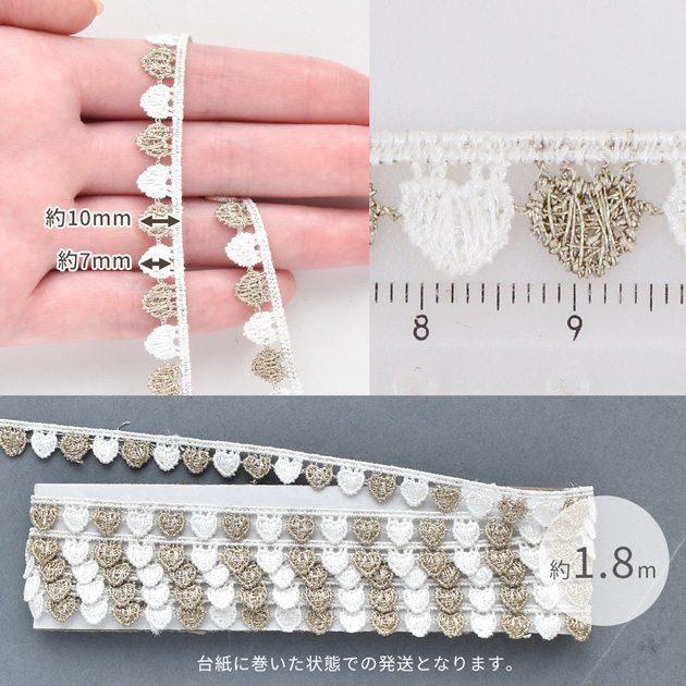 | ケミカル レース ゴールド ラメ入り 2種 24mm幅 1.8m / 14mm幅 2.7m | パーム リーフ 風 ケミカル レース 15mm幅 2.5m | スカラップ ケミカル レース 17mm幅 1.8m |