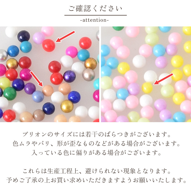 | ■ご注意 | ・手作業で仕分けをしている為、容量が若干異なる場合がございます。 ・同じブリオンでもサイズや量が異なる場合がございます。 ・ブリオンに色ムラやバリ、色が違うものが混入していたり、形が歪な物などがある場合がございます。 これらは製造の過程において避けられない現象となります。 ・生産ロットにより、サイズ・色合いが若干異なる場合がございます。前回お買い上げの商品と異なる場合がございます。 ・画像では100%同じお色を表現することが出来ません。出来る限り近いお色になるよう心がけてはおりますが、お色のイメージが違うことによる返品は承ることができません。 上記の理由での返品交換は承ることは出来ません。 | |