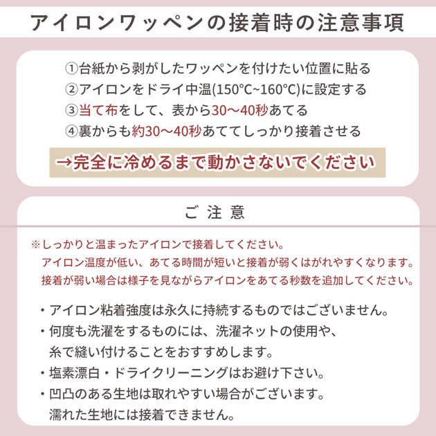 | ■使用する際のご注意 | ・アイロン粘着強度は永久に持続するものではございません。 ・洗濯は可能ですが長持ちさせるため洗濯ネットの使用や手洗いをお薦めします。 ・塩素漂白・ドライクリーニングはお避け下さい。 ・防水・撥水加工、凹凸のある生地、湿った生地・濡れた生地には接着できません。 |