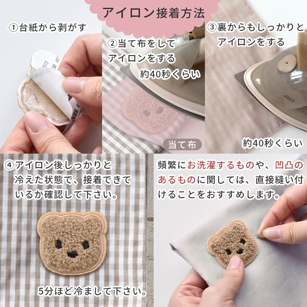 | ■使用方法 | 01)ワッペンを付けたい位置に貼る 02)アイロンをドライ中温(150〜160℃)に設定する 03)当て布をして、表から約30〜40秒あてる 04)裏からも約30〜40秒あててしっかり接着させる →★完全に冷めるまで動かさないでください ※しっかりと温まったアイロンで接着してください。 アイロン温度が低い、当てる時間が短いと接着が弱くはがれやすくなる原因になります。接着が弱い場合は様子を見ながらアイロンを当てる秒数を追加してください。 |