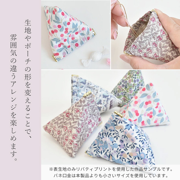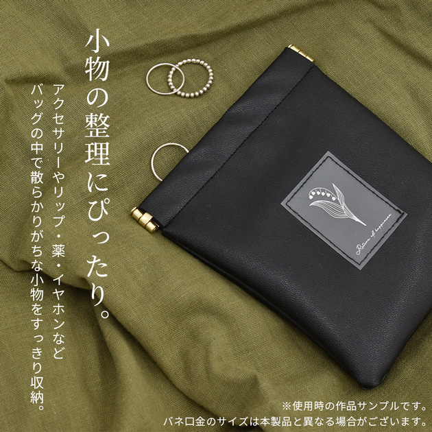 | ■バネ口金具の使い方 | 1.片側のピンを抜きます。手で抜けますが、しっかりと刺さっていて硬い場合は、ペンチやヤットコを使用されることをお勧めします。 2.ピンを抜いたらポーチにバネを通し、抜いたピンをバネにつけ ピンのとがった部分をペンチやヤットコ等で丸めて出来上がりです。 ※バネ部は薄い金属ですので危険です。 付属のピンの頭部分、カンの部分の大きさや形状はロットによる違いがありますが、仕様とご理解ください。返品交換対象外となります。 |