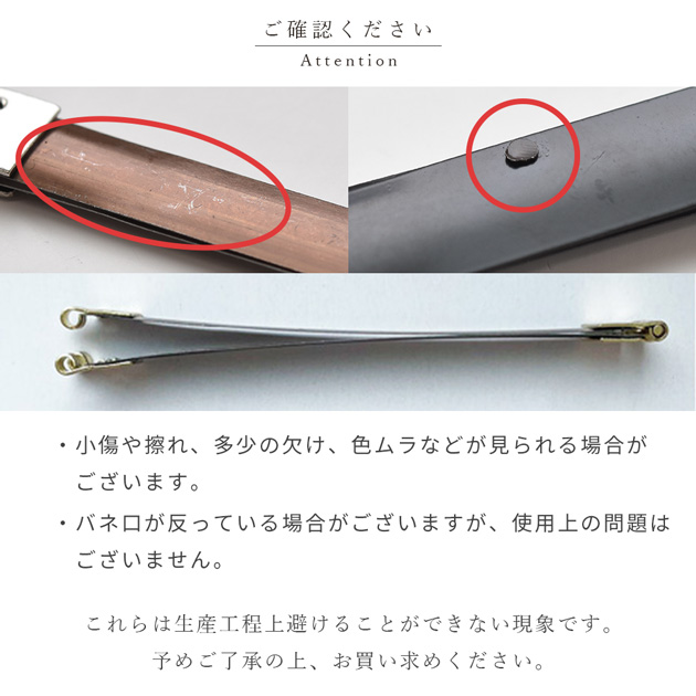 | ■ご注意 | ・発送時に油がついている場合がございます。その際は、拭き取りの上お使いください。 ・小傷や擦れ、多少の欠け、汚れ、色ムラなどが見られる場合がございます。 ・バネ口が反っている場合がございますが、使用上の問題はございません。 ・生産ロットにより、お色やサイズが若干異なる場合があるため、前回のお買い上げ商品と異なる場合がございます。 ・画像では100%同じお色を表現することができません。できる限り近いお色になるように心がけてはおりますが、お色のイメージが異なる場合のご返品は承ることができません。 上記をご理解の上、ご注文いただきますようよろしくお願い申し上げます。 |
