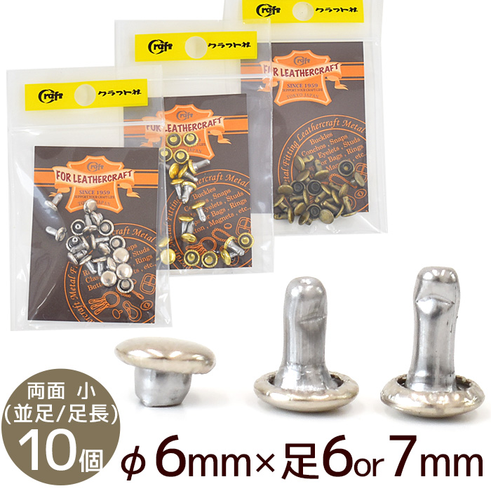 | ■サイズ | 両面カシメ 小 並足 頭の外径:約6mm 足の長さ:約6mm 両面カシメ 小 足長 頭の外径:約6mm 足の長さ:約7mm |