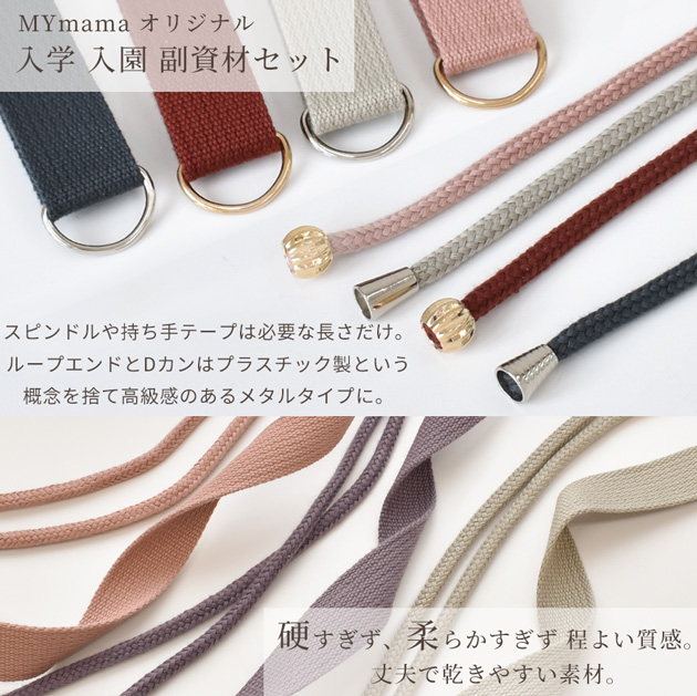 | ■素材 | 持ち手テープ:ナチュラルのみ綿100% その他カラー ポリエステル100% スピンドル:ナチュラルのみ綿100% その他カラー ポリエステル100% Dカン:鉄 ループエンド:合金 |