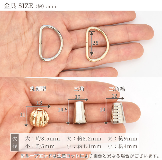 | ■サイズ | 持ち手テープ:約2.5cm幅 スピンドル:中太サイズ 約7mm Dカン:内径25mm ループエンド:丸刻型 約11×13mm 三角 約14.5×10mm 三角縞 約14×12mm ※合わせて画像をご参照下さい。 生産ロットにより、太さがお色味が多少変わる場合がございます。 |