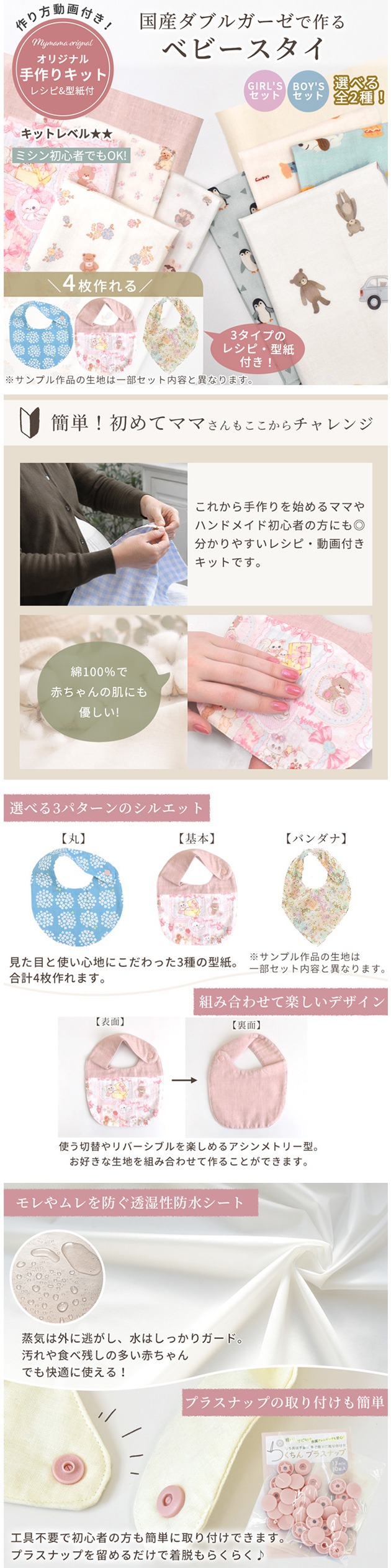 | ■セット内容 | 柄生地:4枚 BOY'Sセット ・幅広 約146cm幅 ダブルガーゼ 生地 アニマルズ 全4柄 GIRL'Sセット ・幅広 約146cm幅 ダブルガーゼ 生地 ドリームメイツ 全3柄 ・幅広 約150cm幅 ダブルガーゼ 生地 スイートフレンズ ・ダブルガーゼ ・薄手接着芯 ・らくちんプラスナップ 13mm ・透湿性防水シート ・レシピ&型紙 |