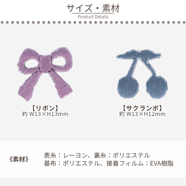 | ■素材 | 表糸:レーヨン 裏糸:ポリエステル 基布:ポリエステル 接着フィルム:EVA樹脂 |