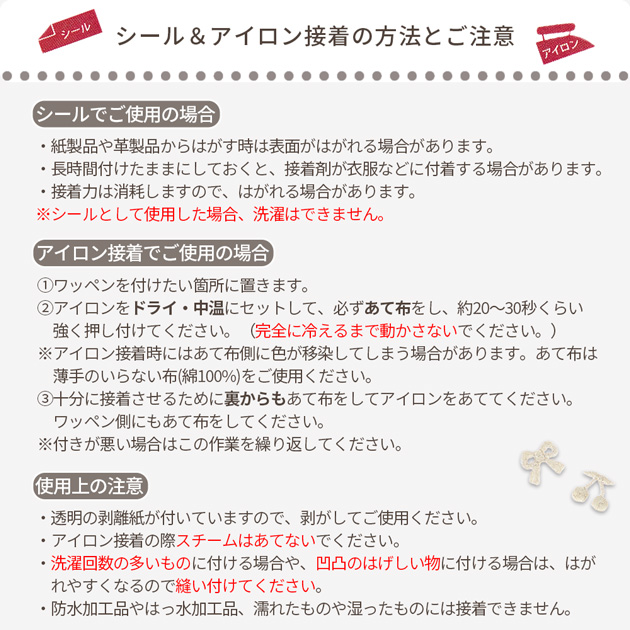 | ■ご使用方法 | - シール接着の場合 - ・貼りたい部分のゴミやホコリを落としてから貼ってください。 ・紙製品や革製品からはがす時は表面がはがれる場合があります。 -アイロン接着の場合- (1)ワッペンを付けたい箇所に置きます。 (2)アイロンをドライ・中温(150℃〜160℃)にセットして、必ずあて布をし、約20〜30秒くらい強く押し付けてください。反対側からもアイロンプレスをするとより強力な接着ができます。 ※完全に冷めるまでは動かさないでください。 ※長期間ご使用になるものや、洗濯回数の多いものなど特に強度が必要な場合は、縫い付けてご使用ください。 |