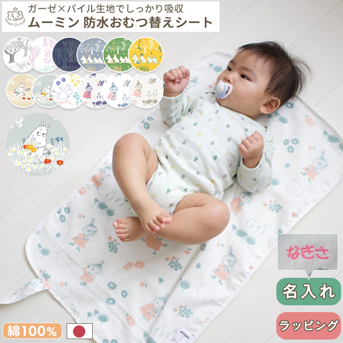 日本製の防水おむつ替えシート。肌に触れる部分は綿100%のダブルガーゼで心地よい肌触り。かわいいムーミン柄。コンパクトに畳めて外出にも便利。