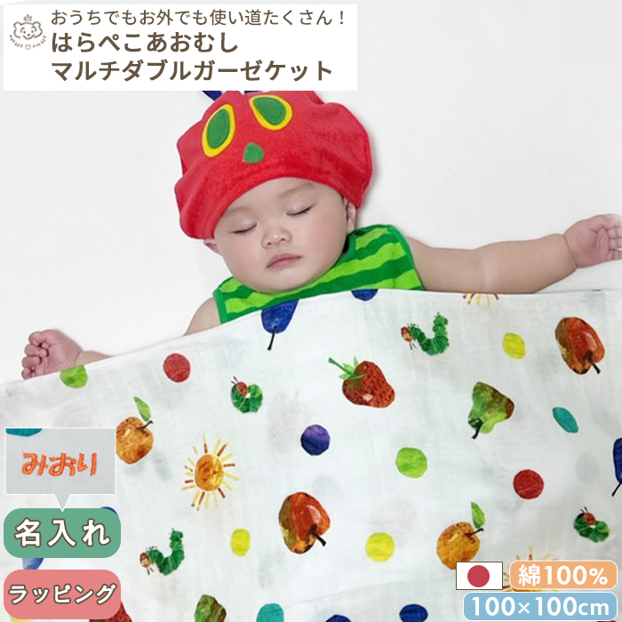 日本製・綿100%のふんわり柔らかダブルガーゼケット。おくるみや授乳ケープなど使い方はいろいろ!オリジナルのはらぺこあおむし柄。