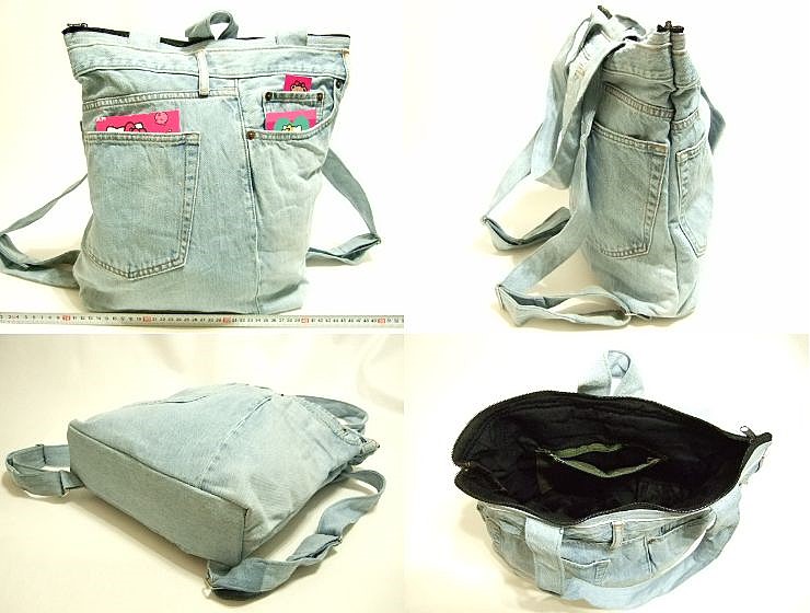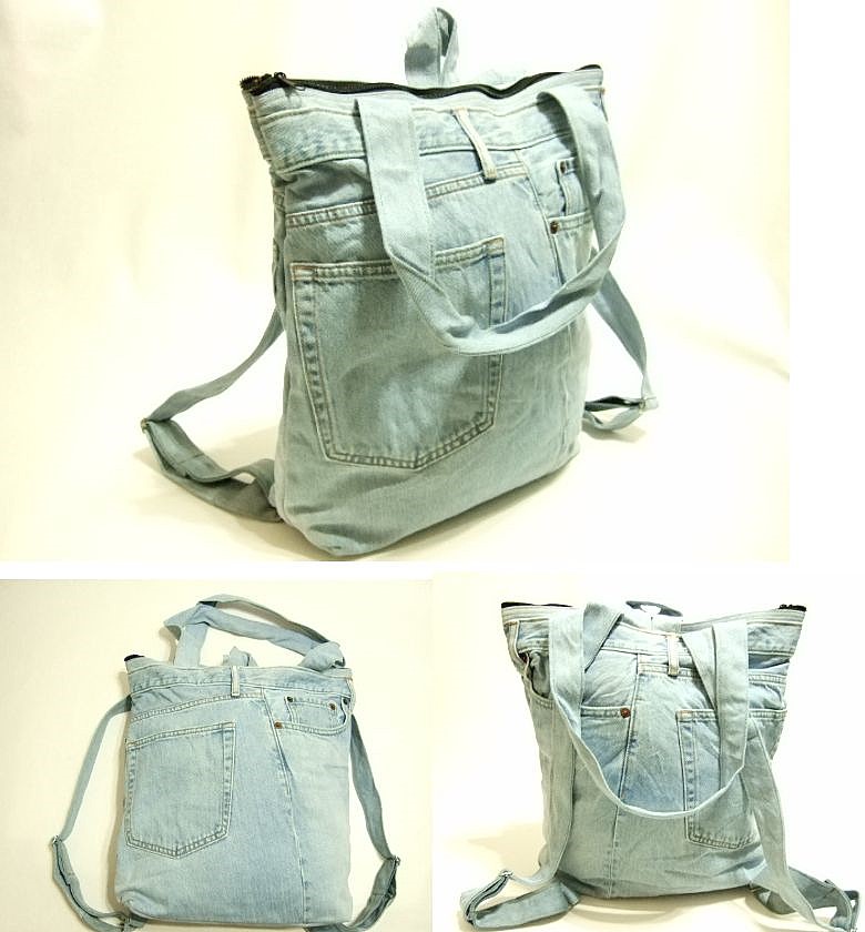 | 商品名 | 横浜最新 魅惑のデニム リュック&トート ツーウェイバッグ紺♪リメイクオリジナルバッグ 横巾30〜37cm 縦38cm マチ8cm底板付 |
