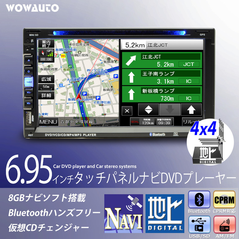カーナビ 6.95インチ 4x4 フルセグテレビ タッチパネル ディスプレイ オーディオ 2DIN スマートフォン連携 ブルートゥース [JT6918]
