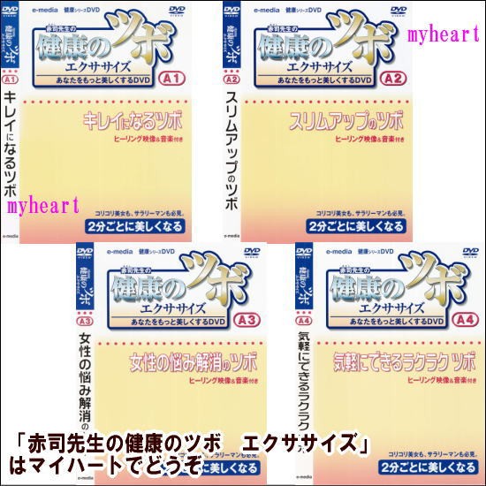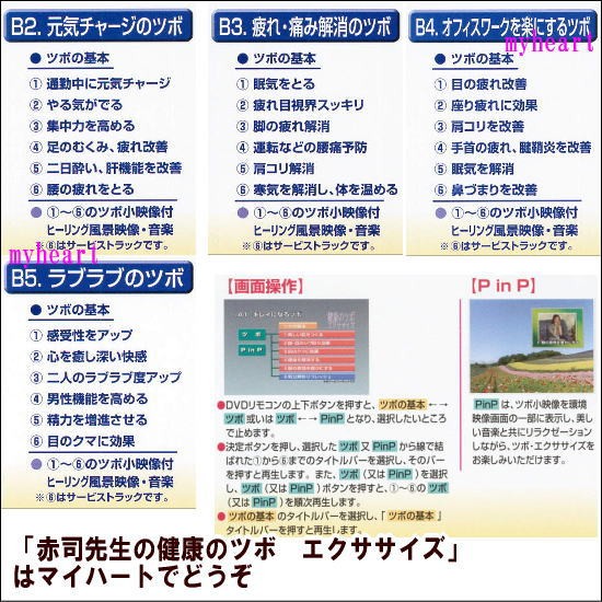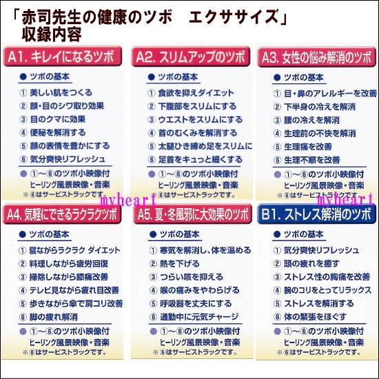 | 【収録内容】 (画像をご参照ください) ■DISC-1:A-1 キレイになるツボ ■DISC-2:A-2 スリムアップのツボ ■DISC-3:A-3 女性の悩み解消のツボ ■DISC-4:A-4 気軽にできるラクラクツボ ■DISC-5:A-5 夏・冬風邪に大効果のツボ ■DISC-6:B-1 ストレス解消のツボ ■DISC-7:B-2 元気チャージのツボ ■DISC-8:B-3 疲れ・痛み解消のツボ ■DISC-9:B-4 オフィスワークを楽にするツボ ■DISC-10:B-5 ラブラブのツボ ※体調、環境により効き目には個人差があります。 |
