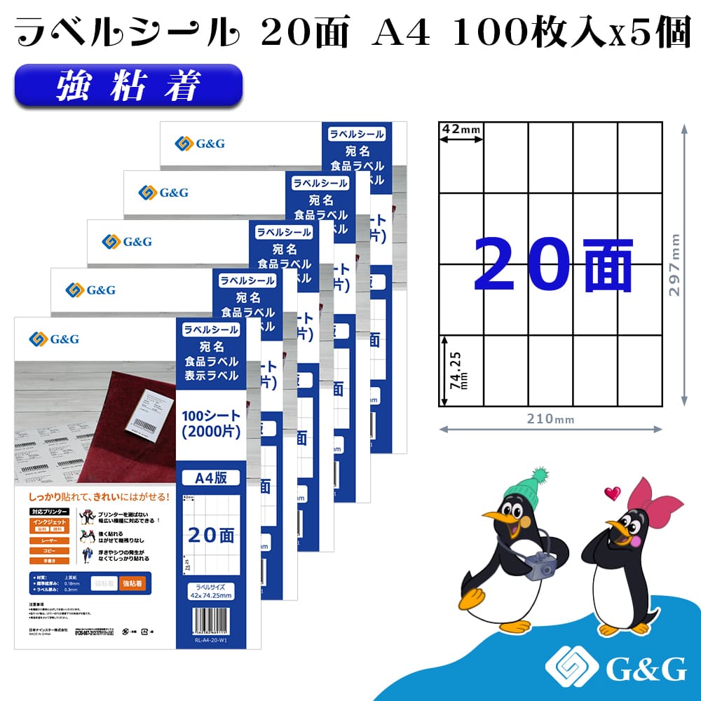 G&G ラベルシール A4 500枚 20面 幅42mm 高さ74.25mm 強粘着 宛名 手紙