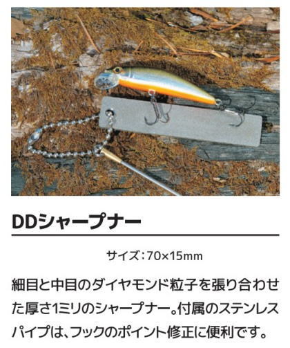 ダイヤモンドによりスピーディーに研磨できます。1mmの薄さにより小さな釣もらくらく研磨。釣先の曲が修復に便利なステンレスパイプ付。