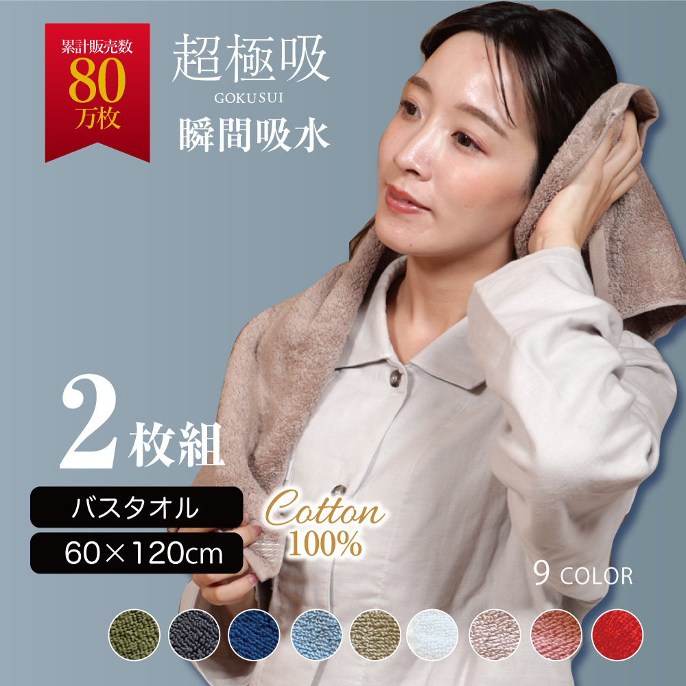 超極吸バスタオル2枚セット(60×120cm)綿100% 速乾吸収性抜群 ジムにスポーツに大活躍 ホテルタオル マイまくら タオルセット まとめ買い