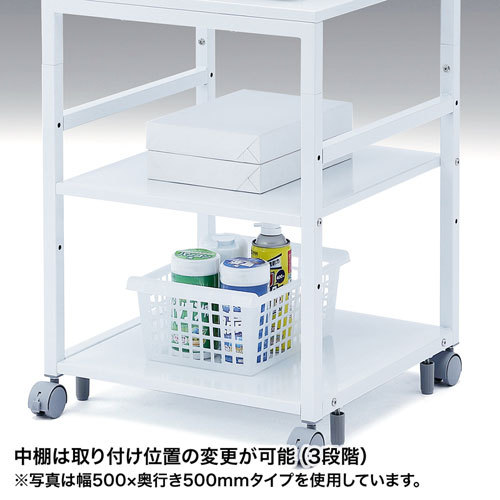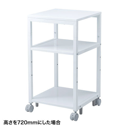 高さ700・720mmの2段階で変更できるスチール製プリンタースタンド。幅400×奥行き400mm。