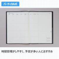 【月間予定欄:ブロックタイプ】スッキリとしたレイアウトが使いやすいブロック式。5週6週併用型なので、書き込むスペース広々。左側にはメモスペースがあるので、ちょっとしたことを書きとめるのにも便利。。  <BR>【週間予定欄:バーティカル式】バーティカル式は時間管理がしやすいレイアウト。空き時間が視覚的にわかるので、無駄な動きを減らせます。忙しい人にもおススメです。右側に大きなメモスペースがあり、アレンジ次第で幅広い使い方ができます。