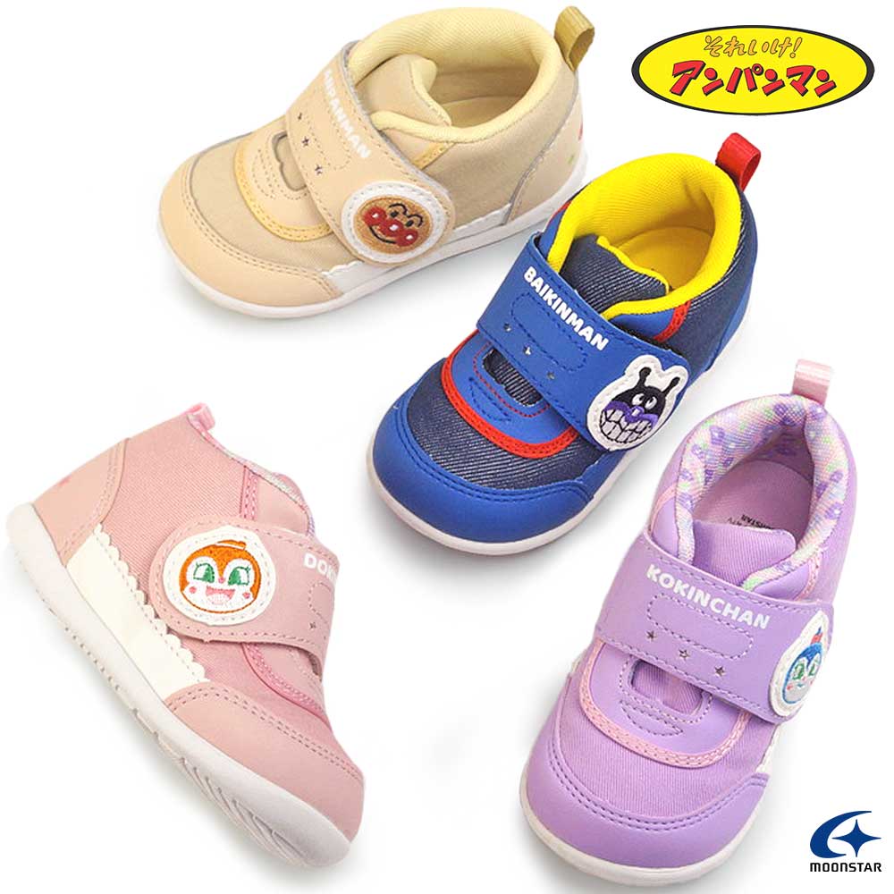 靴 スニーカー ベビーシューズ マジックテープ ムーンスター ネイビー 紫 ピンク あんぱんまん ばいきんまん ドキンちゃん コキンちゃん