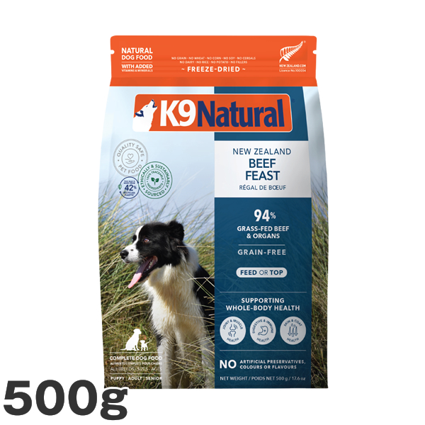 | みんな大好き「牛肉」。カロリーをしっかり摂れるので、 エネルギーをたくさん消費するアクティブなコや、食が細いコにも。 血や筋肉をつくる動物性の鉄分も豊富です。 商品サイズ 水で戻した時の量 15g 60g 142g 568g 500g 2kg 1.8kg 7.2kg 3.6kg 14.4kg 商品特長 本来肉食の犬の体に合わせ、肉類94%以上使用 特殊なフリーズドライ製法により、素材の栄養素や風味はそのまま 穀類・イモ類・豆類、一切不使用 人工保存料・人工着色料・人工香料、一切不使用 子犬からシニア犬まで、全年齢・全犬種対応 食材はすべて人間食用を使用 AAFCO(米国飼料検査官協会)の基準をクリア K9ナチュラルは、原材料の99%以上に自然食材を使用し、その栄養や風味を最大限に生かすため、原材料の加工・加熱を最小限に抑えた特殊なフリーズドライ製法を採用しています。そのため、原材料の収穫時期やサプライヤー(供給元)の違い、季節による家畜・家禽の脂肪分の違い、気候による野菜・果物などの成分の違いなど、素材の特長がそのまま、粒に反映されるため、保証成分値の範囲内ではありますが、粒の形状や、硬さ、色や香りなど、違いがあります。また、一般的なドライフードのように、肉食動物である犬にとって不要な、穀類・イモ類・豆類などの、粘性の高いツナギや量増しとしての原材料を一切使用していないため、1粒1粒が柔らかく、簡単に、ほぐせるようになっています。 K9ナチュラルは、基本的な与え方として、本来の食事に近づけるために、生食の水分値に戻してから与えていただくフードですので、粉状になっているものはそのまま、粒状のものはくずしてから、水かぬるま湯(37℃以下)を加えると、短い時間で、戻ります。 ≪粒の形状について≫ フリーズドライ商品につきましては、犬や猫の消化器官に配慮し、穀類・イモ類・豆類などの、「つなぎ」を一切使用せず、焼き固めてもいないため、粒が柔らかく、製造ロットにより、あらかじめ細かく、くずれているものがございます。 お肉の性質上、チキンや魚を使用している種類は、粒が特に柔らかいため、その傾向が見受けられますが、品質には問題ございませんので、安心してご使用ください。 原材料 牛肉、心臓(牛)、グリーントライプ(牛)、腎臓(牛)、肝臓(牛)、肺(牛)、ひまわり油、フラックスシードフレーク、にんじん、ニュージーランド緑イ貝、かぼちゃ、ブロッコリー、乾燥昆布、リン酸二カリウム、ビタミンE、塩化ナトリウム、ミネラル類(プロティネイト亜鉛、プロティネイト鉄、酸化マグネシウム、セレン酵母、プロティネイト銅、プロティネイトマンガン)、ビタミン類(ビタミンB1、ベータカロチン、葉酸、ビタミンD3) K9ナチュラルに使われる肉は全て、ニュージーランドの肥沃な大地で放牧されて育った健康な家畜だけを使っています。これらの肉類には、成長ホルモン剤、抗生物質、サプリメントなどは不使用。病気で死んだ家畜や衰弱した家畜、廃棄部分(ヒヅメ、尻尾、鼻など)も一切使用していません。 与え方 ▼1日分の推奨給与量ガイド ●成犬:1kgあたり、フリーズドライ約8g(+3倍量の水) 例:体重5kgの場合 5×8g=40g(+水120ml) ※1回分の食事量は、1日に与える回数で割ります。 ●パピー 生後2ヶ月〜6ヶ月の場合 成犬の最大約2〜3倍まで 生後6ヶ月〜12ヶ月の場合 成犬の約1.5倍〜2倍 ※現在の体重を基に計算してください。 推奨給与量は、目安に過ぎません。個体差がありますので、愛犬の体重の増減や活動量を考慮して、必要に応じて給与量を調整してください。 妊娠期・授乳期の犬には、成犬の約2倍の量が必要です。また2種類以上のK9ナチュラルをローテーションで与えることもお勧めしています。 栄養情報 保証分析値 粗たん白質 40.0%以上 粗脂肪 33.0%以上 粗繊維 2.5%以下 粗灰分 10.0%以下 水分 8.0%以下 オメガ3脂肪酸 0.50%以上 オメガ6脂肪酸 2.00%以上 100g中のカロリー 490.5kcal よくあるご質問 素材の肉の種類にって、栄養上に違いがあるのでしょうか? 肉(動物)の種類の違いによって、タンパク質や脂肪の含有量の違いがありますが、どの種類のK9ナチュラルにも十分なビタミン、ミネラルなどが含まれていて、自然界での食事と同じような内容になっています。ラム(子羊)、ビーフ(牛肉)、チキン(鶏肉)、ラム&キングサーモン(子羊肉と鮭)、ビーフ&ホキ(牛肉と白身魚)、この5種類を交互に与えることで、自然界での捕食(肉食動物が餌となる対象の動物を捕らえて食べること)と同様のバラエティーが得られ、栄養バランスがさらに良くなります。ぜひお試しください。 K9ナチュラルのフードは、お水で戻さずに与えても大丈夫ですか? フリーズドライのまま与えても大丈夫です。ですが、本来、肉食動物は、生きている動物を狩り、生で食すことで水分を得ていました。現代の多くの犬やネコが抱えている腎臓疾患の原因のひとつは、水分摂取の不足です。食事から水分摂取をすることが、とても大事ですので、生食を食べた時と同じ栄養と水分が取れるように、