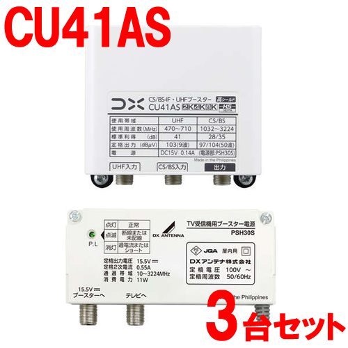 業者様必見! CU41AS まとめ買いで更にお安く! ↓ ↓ 品名/型番:CS/BS-IF・UHFブースター/CU41AS 使用帯域:UHF/CS/BS-IF 周波数帯域(MHz):470〜710(UHF)/1032〜3224(1032〜2150)(CS/BS-IF) 標準入力レベル範囲(dBμV):41〜62(72)(注1)(UHF)/43〜69(79)(注2)(CS/BS-IF) 標準利得(dB):41(UHF)/28/31/35(1032/2150/3224MHz)(CS/BS-IF) 定格出力レベル(dBμV):103(9波)(UHF)/97/100/104(1032/2150/3224MHz)(CS/BS-IF) 利得切換(入カレベル調整)(dB):31,41(スイッチ切換式)(UHF)/18/25.28/35(スイッチ切換式)(CS/BS-IF) 利得調整範囲(dB):0〜-10以上(連続可変) 帯域内周波数特性(dB):±2.5以内(UHF)/全帯域で±3.0以内任意の34.5MHzで±2.0以内(CS/BS-IF) 雑音指数(dB):1.5以下(注3)(UHF)/6.0以下(CS/BS-IF) 入出力インピーダンス(Ω):75(F形) VSWR:2.5以下 相互変調(IM3)(dB):-68以下(注4)(UHF) CIN(dB):-22以下(CS/BS-IF) 出力モニター(dB):-20 直流供給電源:DC15V/0.10A(UHF)/DC15V/0.27A(CS/BS-IF) 電源/消費電力:AC100V(50/60Hz)/3.4W、4.8W(注5).8.1W(注6)、9.0W(注7) 電源/消費電流:DC15V/0.14A、0.24A(注5)、0.41A(注6)、0.51A(注7) 使用温度範囲(℃):-20〜50 漏洩電界強度(dBμV/m):34.0以下(UHF)/40.2以下(CS/BS-IF) 外形寸法(mm):84(H)×90(W)×47(D) 防水性能:IPX4(防沫形) 適合マスト径(mm):Φ22〜49 質量(kg):0.22 【電源部(PSH30S)】 周波数帯域(MHz):10〜3224 電源/定格消費電力:AC100V(50/60Hz) /11W 重畳電源:DC15.5V / 0.55A 入出カインピーダンス(Ω):75(F形) 挿入損失(dB):0〜1.2(10〜1000MHz)0〜2.0(1000〜2610MHz)0〜2.5(2610〜3224MHz) 使用温度範囲(℃):-10〜+40 外形寸法(mm):60(H)×107(W)×31(D) 質量(kg):0.2 (注1)( )内は入力ATTを[-10dB]にした時の最大入力レベルです。 (注2)( )内は入力ATTを[-10dB]にした時の最大入力レベルです。 (注3)470〜500MHz:1.7以下、650〜710MHz:1.8以下 (注4)利得最大時 (注5)UHF電源給電時 (注6)CS/BSコンバータ用電源給電時 (注7)CS/BSコンバータ用電源+UHF電源給電時 メーカー:DXアンテナ 【3台セット】【利得切替スイッチ切換式】 |