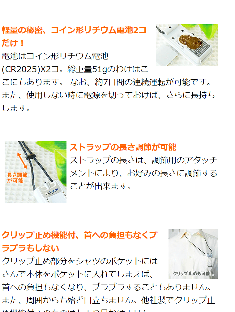 ●軽量51gの手のひらサイズ。首から掛けて、いつでもどこでも花粉対策ができる。