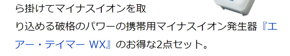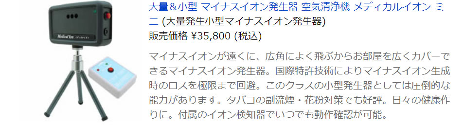 ●小型ながら実績多数、マイナスイオンを大量に広く行き渡らせることができるハイパワーマイナスイオン発生器『メディカルイオン ミニ』、首から掛けてマイナスイオンを取り込める破格のパワーの携帯用マイナスイオン発生器『エアー・テイマー WX』のお得な2点セット。