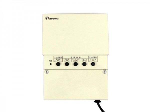 ●主な仕様:入力回路:ページング入力 10kΩ -22dBV出力回路:600Ω -20dBV(0dBV切換可)予告音:4音(ドミソ・ピンポン・ドミソド・ピピピピピ)うち1音選択チャイム音:ウエストミンスター、ホイッティングトンのうち1音選択起動方式:無電圧接点方式とDC受電方式(兼用)調節機能:音量調節器及び、テンポ調節器付電源電圧:AC100 50/60Hz寸法:幅110×高さ161×奥行50mm質量:約0.75kg