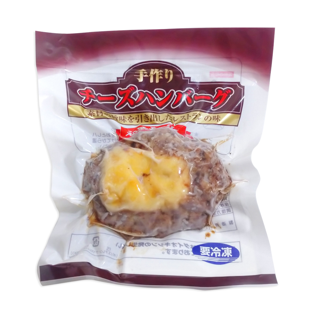 原材料名:(ハンバーグ)食肉等(豚肉(国産)、牛肉(国産)牛脂肪、豚脂肪)、玉ねぎ、つなぎ(パン粉、鶏卵)、食塩、香辛料、具(チーズ)(原材料の一部に大豆を含む)
