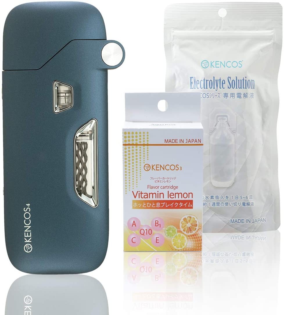 [ポータブル水素ガス吸引具 スターター3点セット] KENCOS4(ケンコス4) ネイビー+フレーバーカートリッジ(3本入)ビタミンレモン+電解液