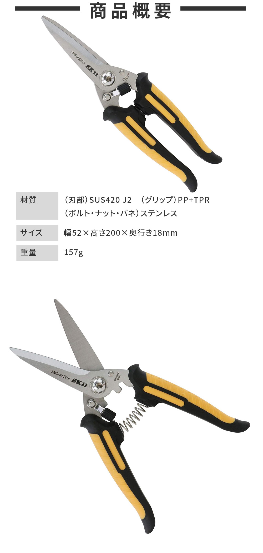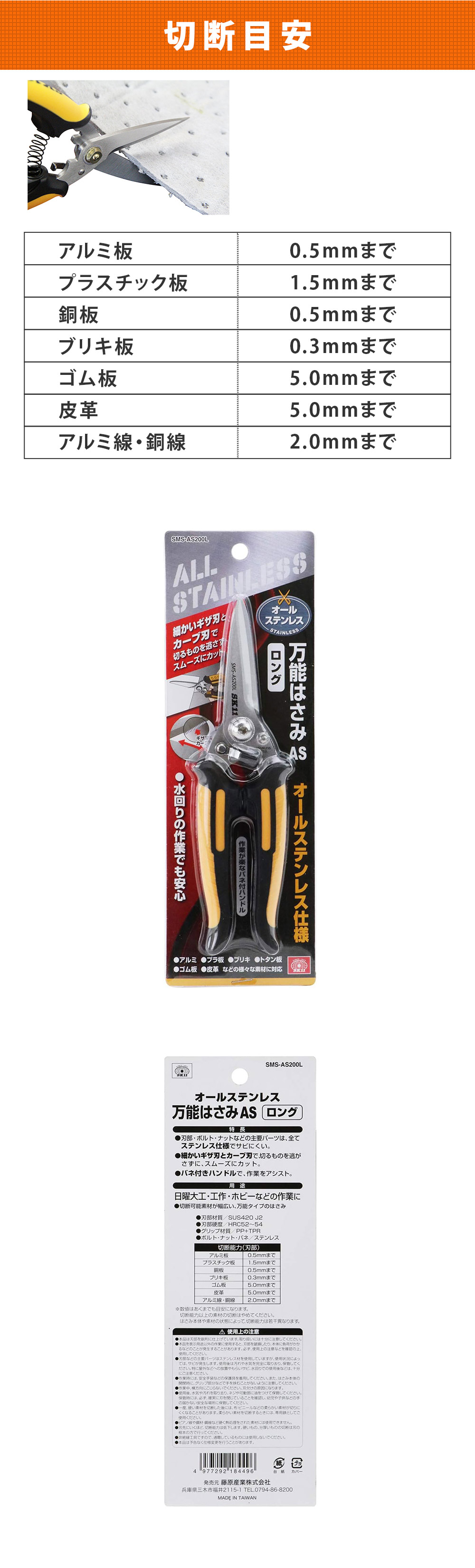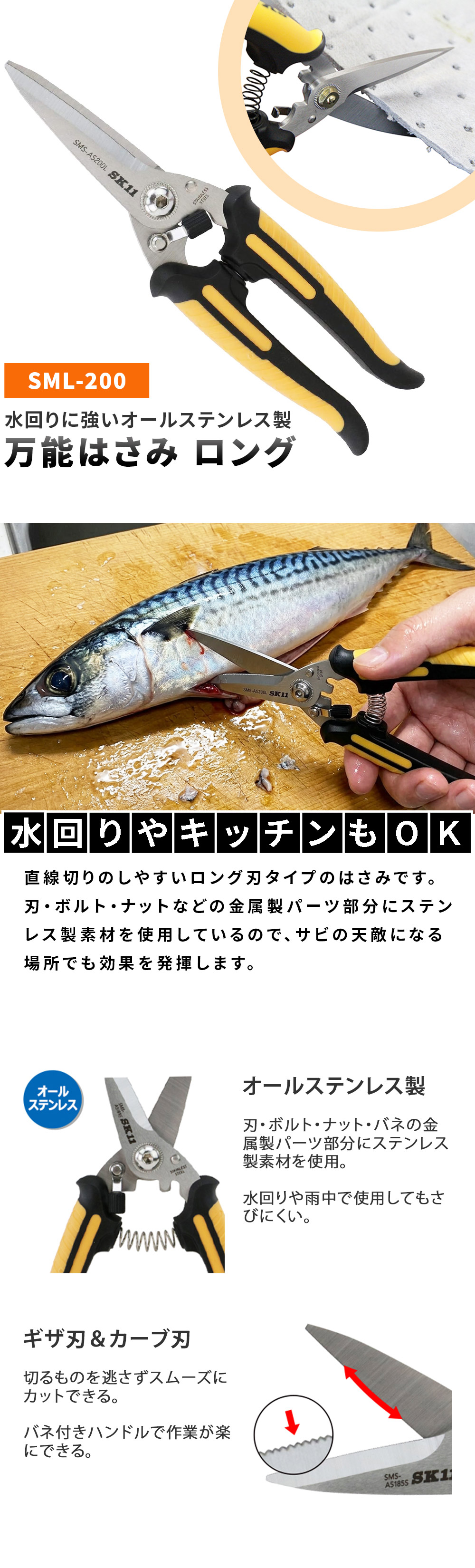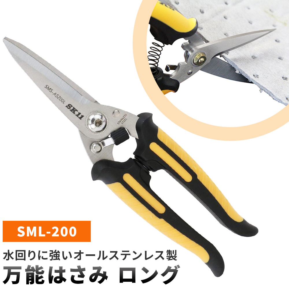 万能はさみ AS ロング SMS-AS200L バネ付きハンドル オールステンレス SK11 ギザ刃 カーブ刃 錆に強い スプリング付 キッチン 調理用