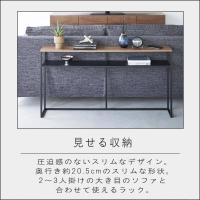 圧迫感のないスリムなデザイン。奥行き約20.5cmのスリムな形状。2〜3人掛けの大き目のソファと合わせて使えるラック。